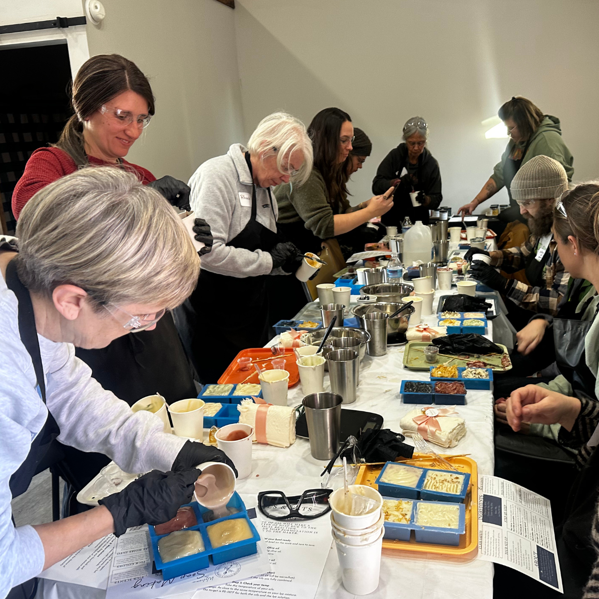 We’ll gear up with an apron, goggles, and gloves (all provided), then weigh and mix our oils. Next you’ll make your lye solution, and while it cools, you’ll choose your scent and clay color. Once everything is ready, we’ll blend it all together, stir in your clay and scent, and pour into your mold. You’ll head home with your soap filled, labeled, and ready to harden on the counter.